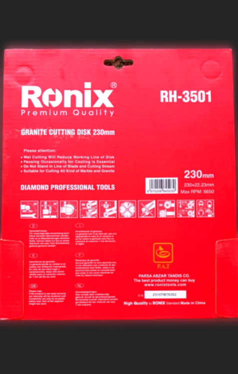 صفحه گرانیتبر بزرگ 230 میلیمتری رونیکس با مدل 3506-RH، برای برش انواع گرانیت استفاده میشود و در فرز و سایر دستگاههای سنگبری، عملکرد فوقالعادهای از خود نشان میدهد.