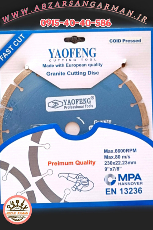 صفحه گرانیت بر یائوفنگ YAOFENG، دارای سگمنت های قوی و مستحکم بوده و برای برش انواع مصالح ساختمانی نظیر گرانیت، مرمریت، موزاییک، سیمان، بتون و … مناسب می باشد. این تیغه بر روی فرزهای دستی نصب شده و با کیفیت بالا فرایند برش را به انجام می رساند. بدنه فولادی قوی، سگمنت های دارای فشردگی بالا و در ابعاد مناسب از ویژگی ها و برتری های این دیسک برش می باشد.